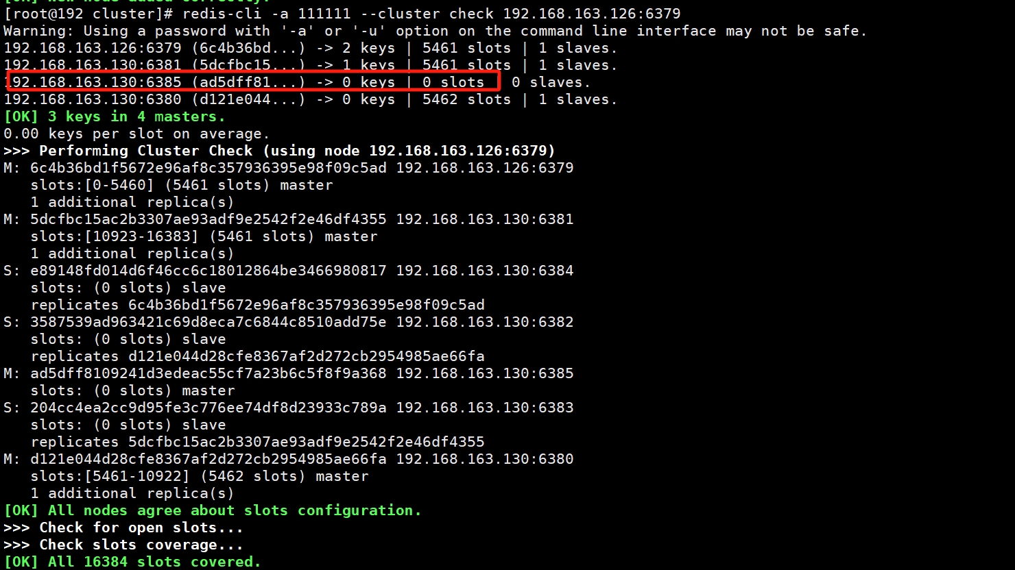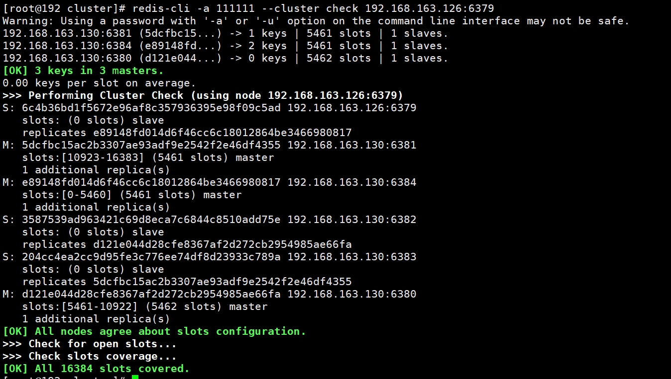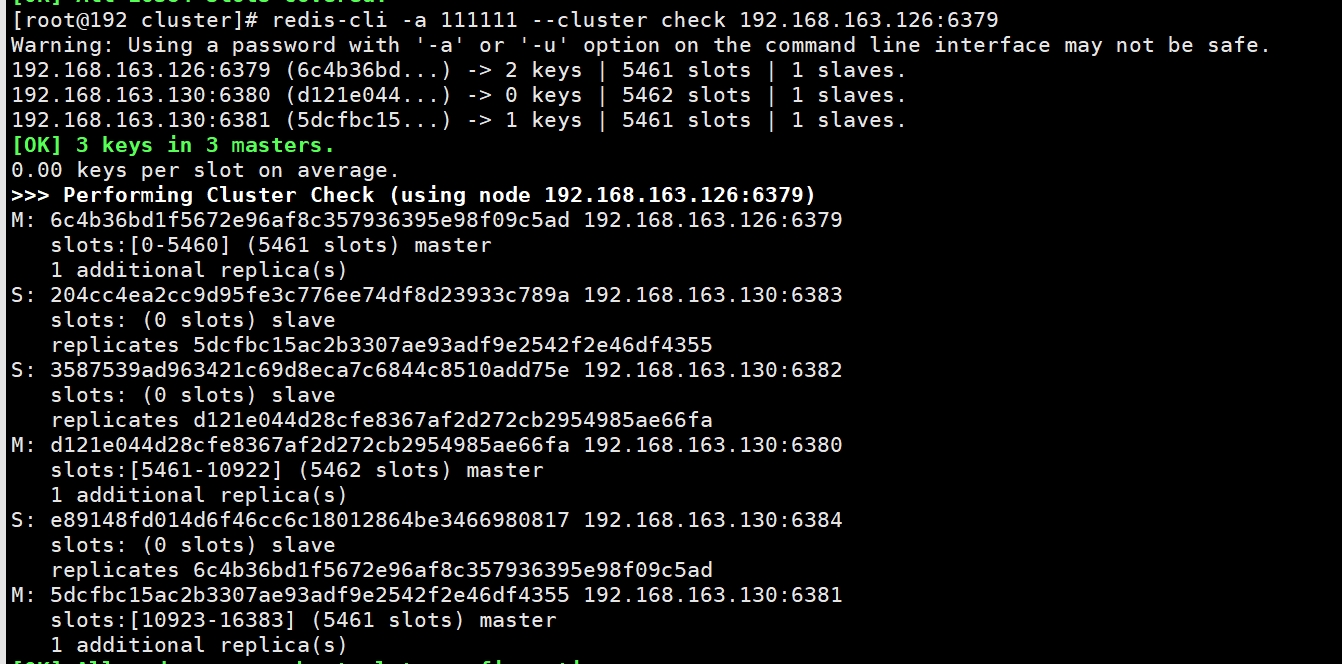 redis-cli -a 111111 --cluster check 192.168.163.126:6379