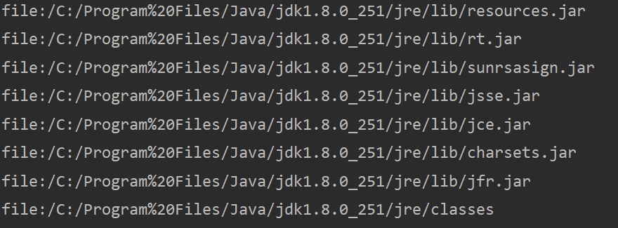 URL[] urLs = Launcher.getBootstrapClassPath().getURLs(); for (URL urL : urLs) { System.out.println(urL.toExternalForm()); }