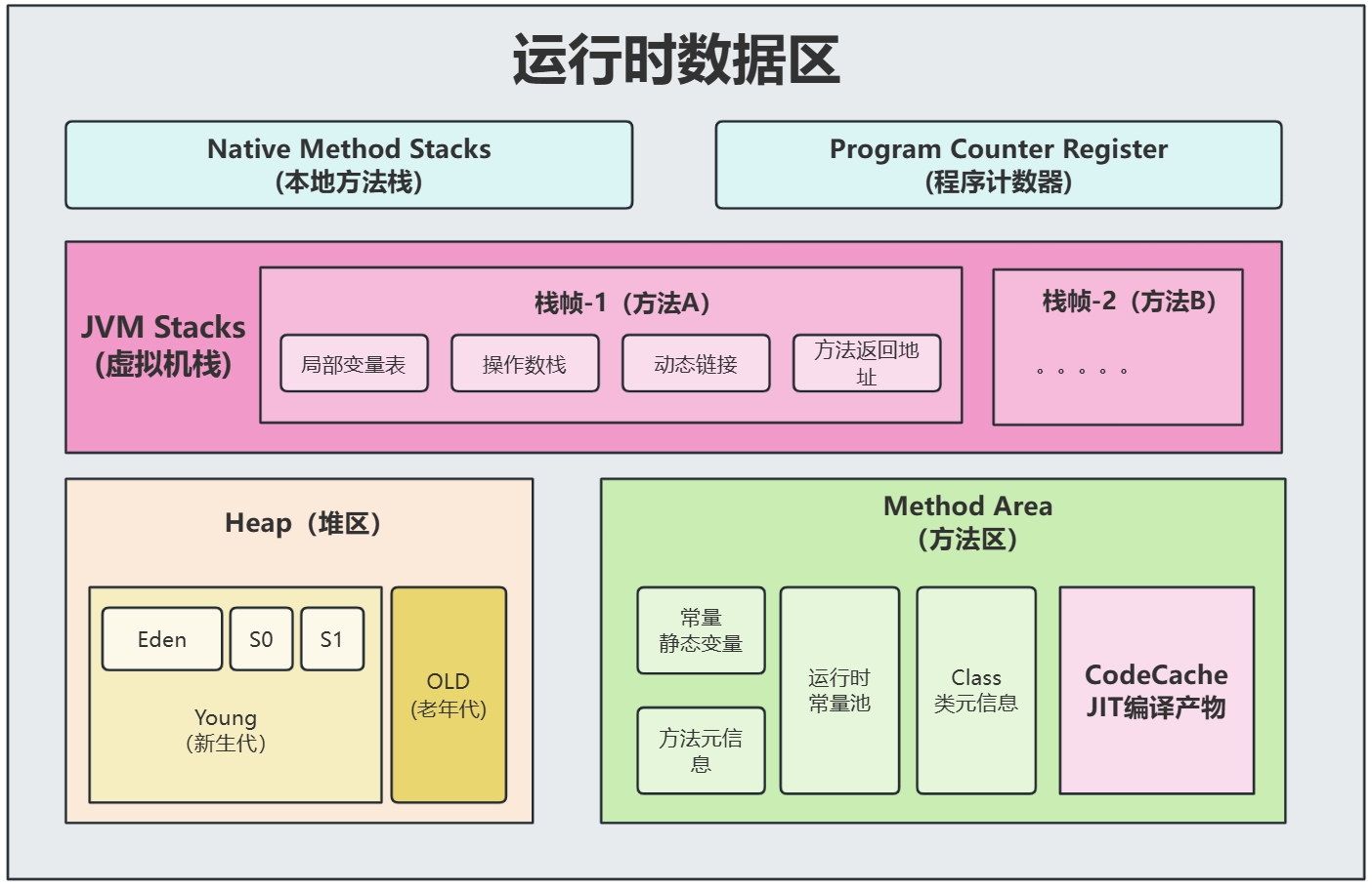 - 加载的类信息存放在方法区(元空间)的内存空间。除了类的信息外,方法区还会存放运行时常量池信息,可能还包括字符串字面量和数字常量(这部分常量信息是Class文件中常量池部分的内存映射)