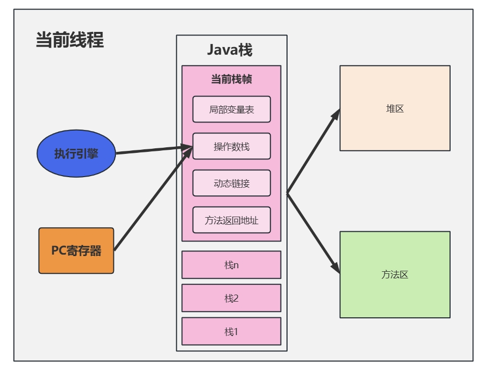 - 执行引擎运行的所有字节码指令只针对当前栈帧进行操作