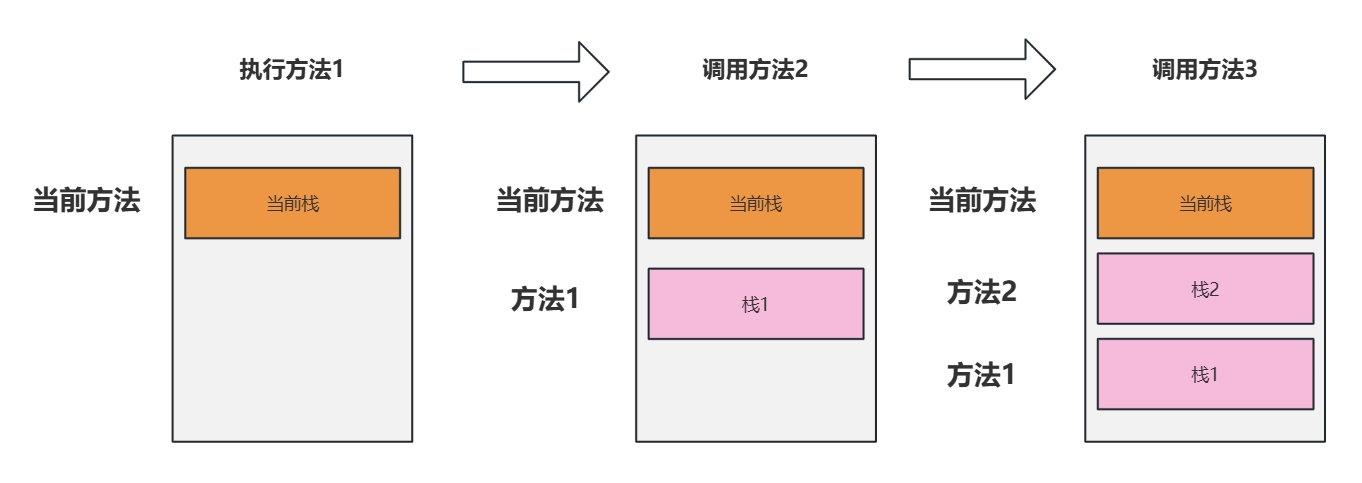 - 如果该方法中调用了其他方法,对应的新的栈帧会被创建出来,放在栈的顶端,称为新的当前栈。