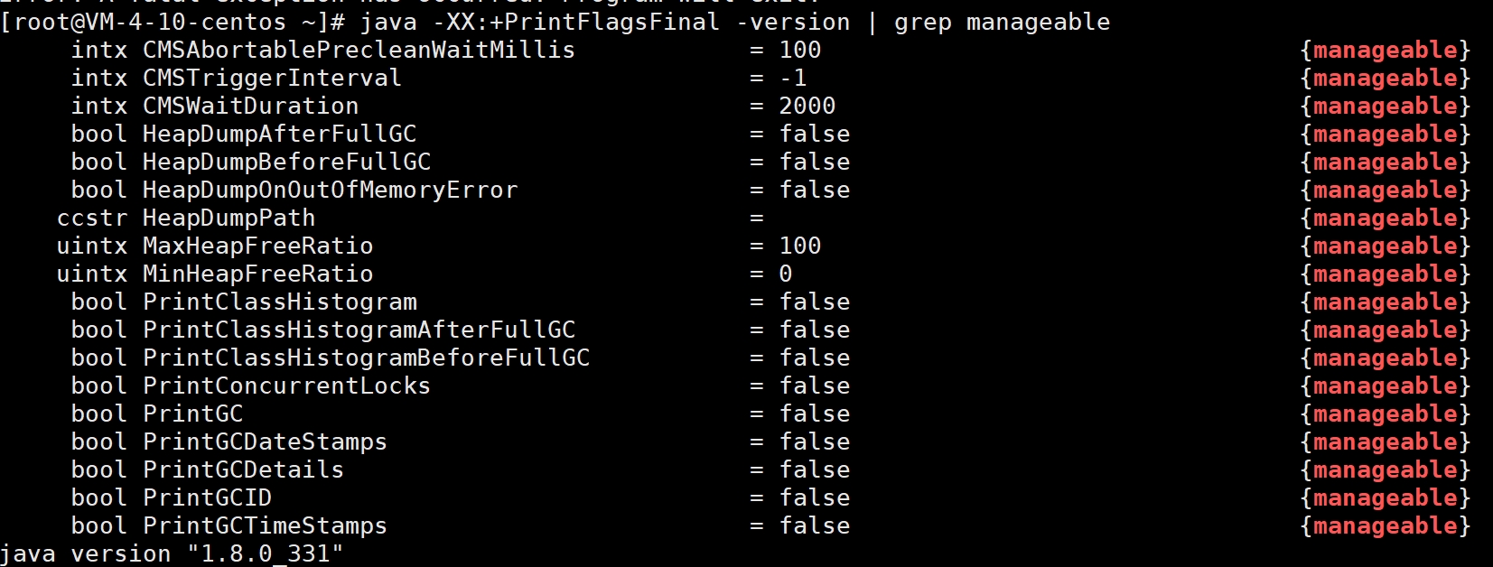 java -XX:+PrintFlagsFinal -version |grep manageable