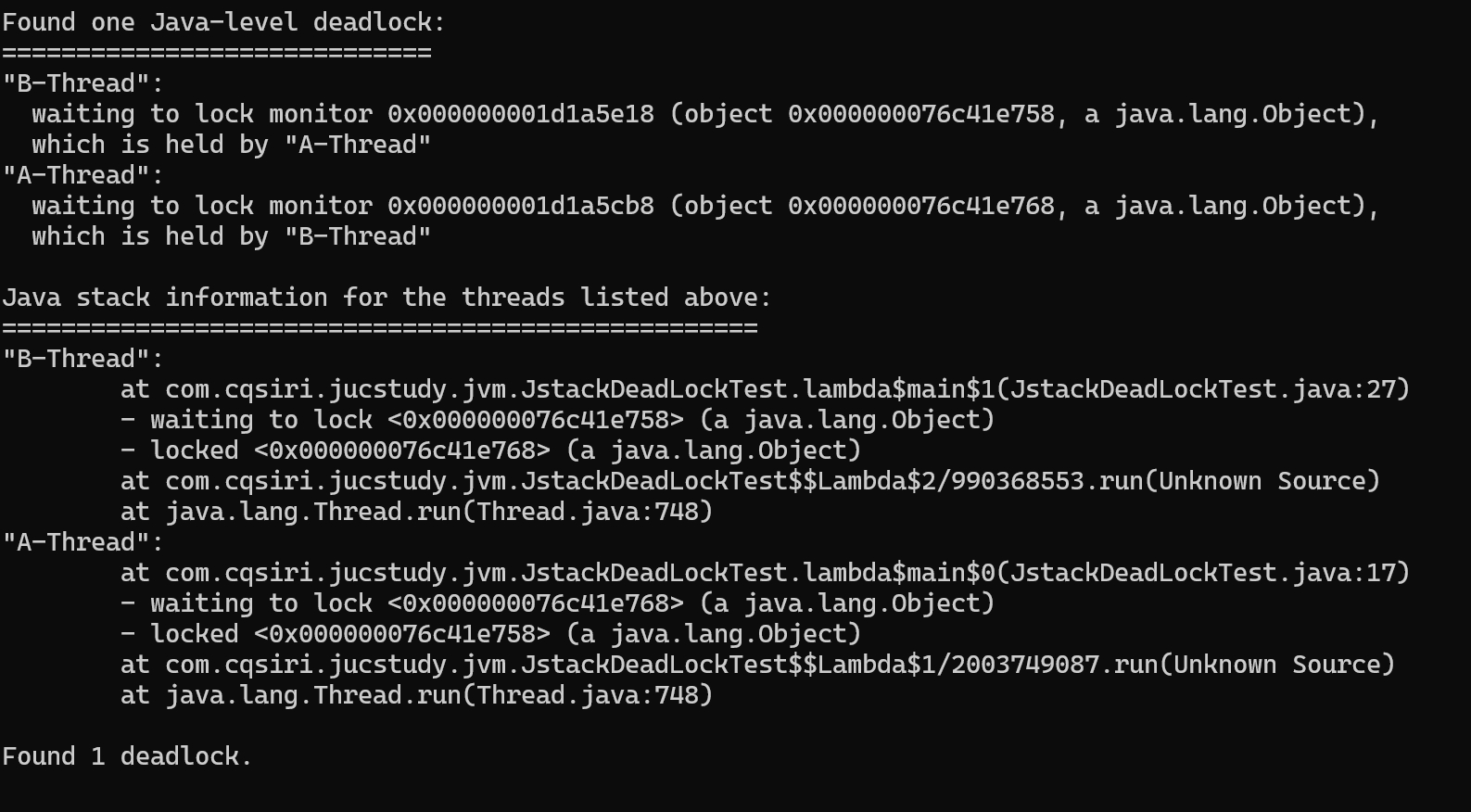 public class JstackDeadLockTest { public static void main(String[] args) throws IOException { Object obj1 = new Object(); Object obj2 = new Object(); new Thread(() -> { synchronized (obj1) { try { Thread.sleep(1000); } catch (InterruptedException e) { e.printStackTrace(); } synchronized (obj2){} } }, "A-Thread").start(); new Thread(() -> { synchronized (obj2) { try { Thread.sleep(1000); } catch (InterruptedException e) { e.printStackTrace(); } synchronized (obj1){} } }, "B-Thread").start(); System.in.read(); } }jstack查看,jstack PID