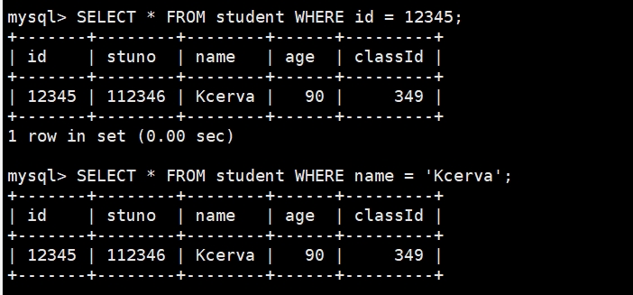 SELECT * FROM student WHERE id = 12345; SELECT * FROM student WHERE name = 'Kcerva';