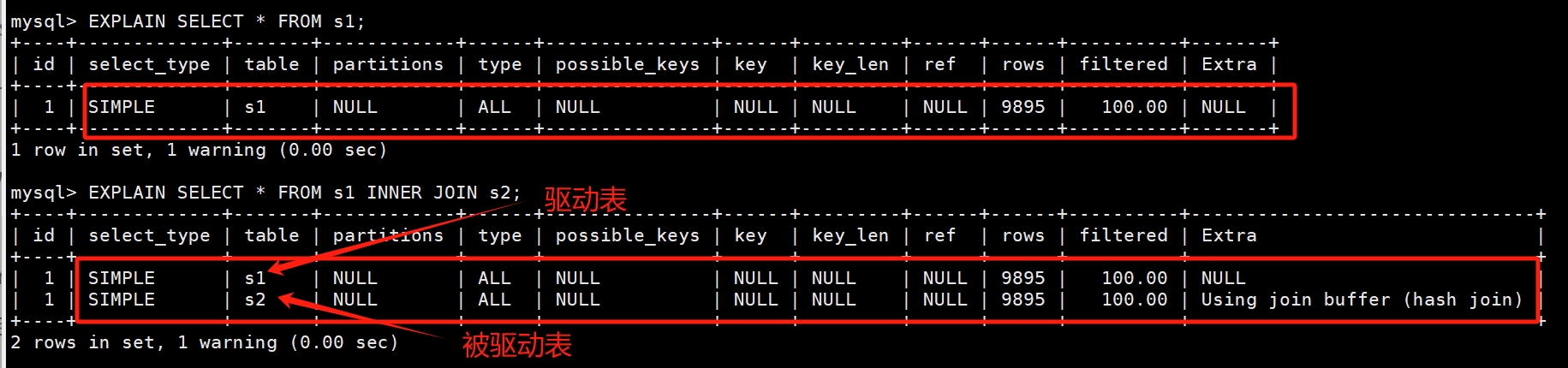 EXPLAIN SELECT * FROM s1; EXPLAIN SELECT * FROM s1 INNER JOIN s2;