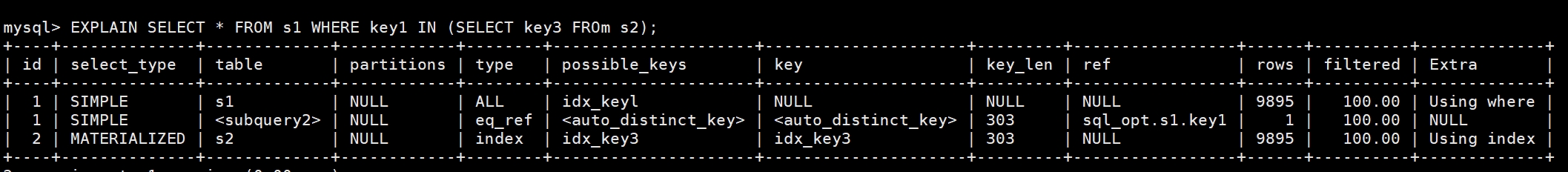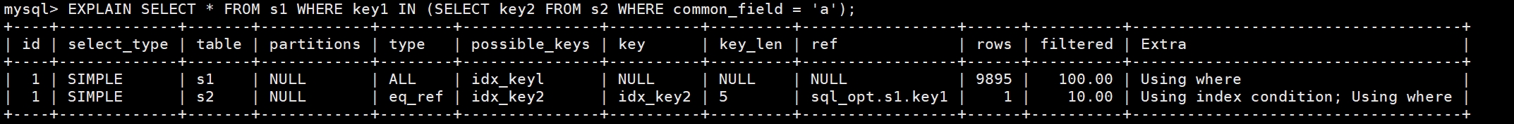 EXPLAIN SELECT * FROM s1 WHERE key1 IN (SELECT key2 FROM s2 WHERE comon_field = 'a'); // 执行后发现只有一个id:1