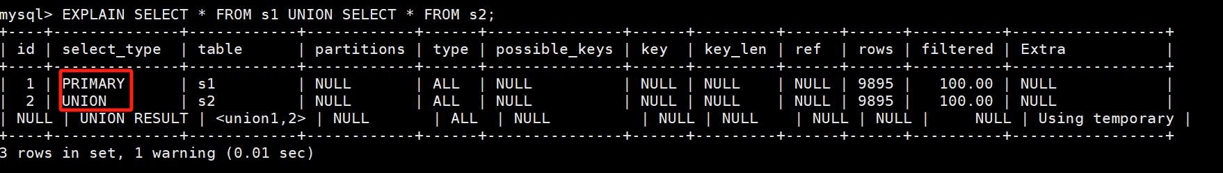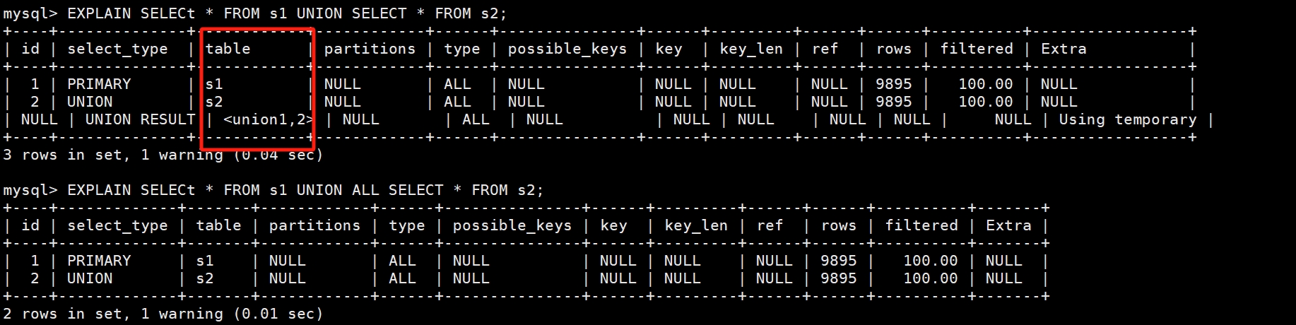 EXPLAIN SELECt * FROM s1 UNION SELECT * FROM s2; EXPLAIN SELECt * FROM s1 UNION ALL SELECT * FROM s2; // 由于union会进行去重操作,所以多了一个临时表union.1.2