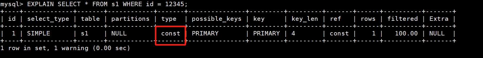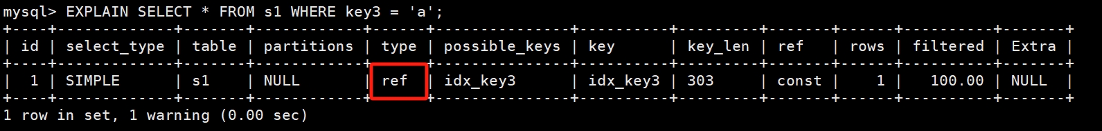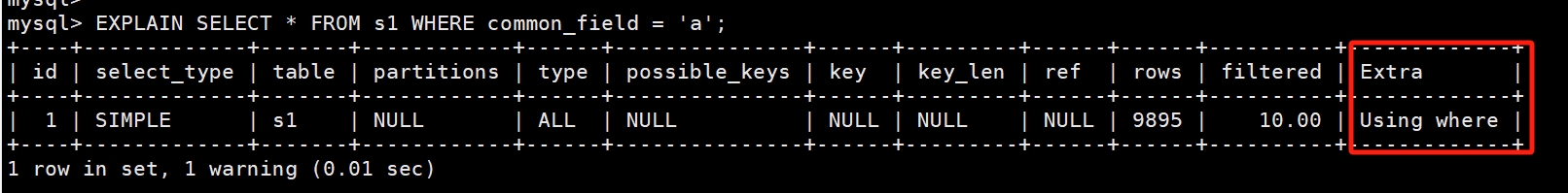 WHERE子句中有针对该表的搜索条件是EXPLAIN SELECT * FROM s1 WHERE common_field = 'a';