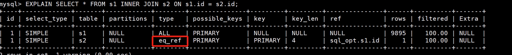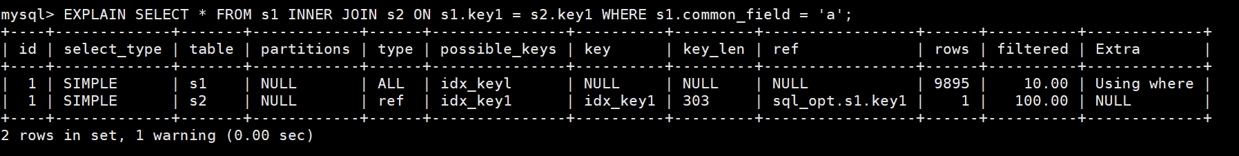 EXPLAIN SELECT * FROM s1 INNER JOIN s2 ON s1.key1 = s1.key1 WHERE common_field = 'a';