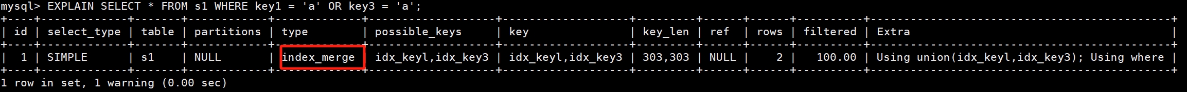 Intersection、Union、Sort-Union这三种索引合并的方式来执行查询EXPLAIN SELECT * FROM s1 WHERE key1 = 'a' OR key3 = 'a';