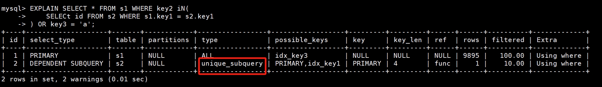IN子查询的语句中,如果查询优化器觉得将IN子查询转换为EXISTS子查询,而且子查询可以使用到主键进行等值匹配的话,那么该子查询执行计划的type值就是uniqe_subqueryEXPLAIN SELECT * FROM s1 WHERE key2 iN( SELECt id FROM s2 WHERE s1.key1 = s2.key1 ) OR key3 = 'a';