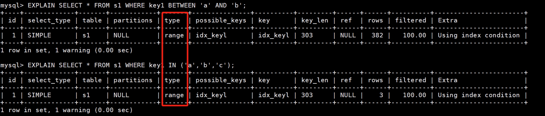 EXPLAIN SELECT * FROM s1 WHERE key1 IN ('a','b','c'); EXPLAIN SELECT * FROM s1 WHERE key1 BETWEEN 'a' AND 'b';