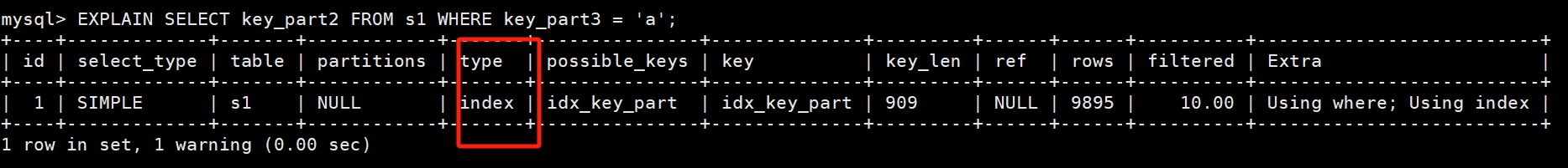 EXPLAIN SELECT key_part2 FROM s1 WHERE key_part3 = 'a';