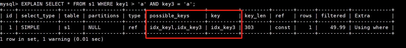 EXPLAIN SELECT * FROM s1 WHERE key1 > 'a' AND key3 = 'a';