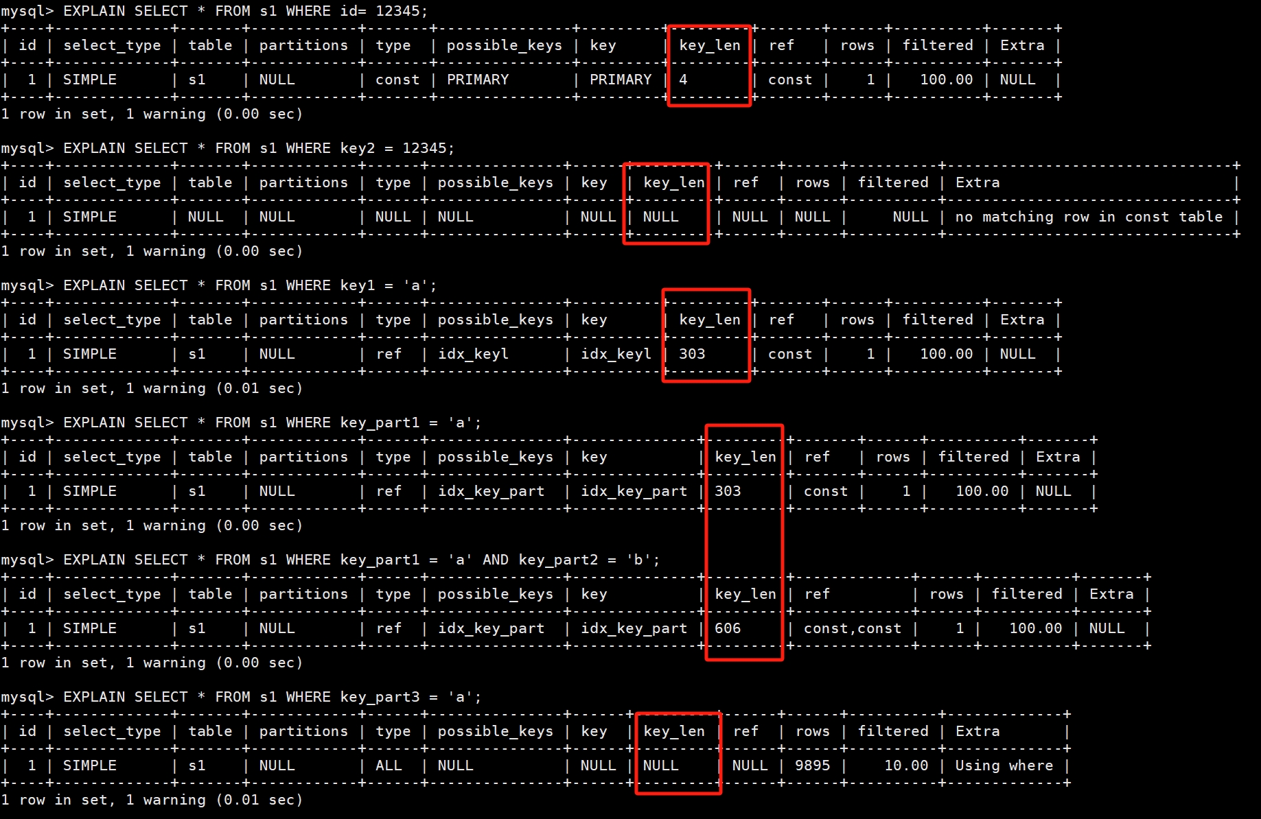 EXPLAIN SELECT * FROM s1 WHERE id= 12345; EXPLAIN SELECT * FROM s1 WHERE key2 = 12345; EXPLAIN SELECT * FROM s1 WHERE key1 = 'a'; EXPLAIN SELECT * FROM s1 WHERE key_part1 = 'a'; EXPLAIN SELECT * FROM s1 WHERE key_part1 = 'a' AND key_part2 = 'b'; EXPLAIN SELECT * FROM s1 WHERE key_part3 = 'a';