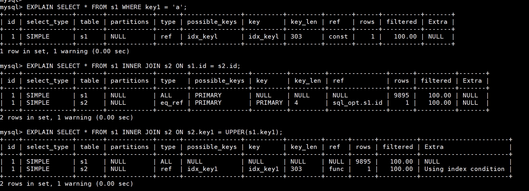 EXPLAIN SELECT * FROM s1 WHERE key1 = 'a'; EXPLAIN SELECT * FROM s1 INNER JOIN s2 ON s1.id = s2.id; EXPLAIN SELECT * FROM s1 INNER JOIN s2 ON s2.key1 = UPPER(s1.key1);