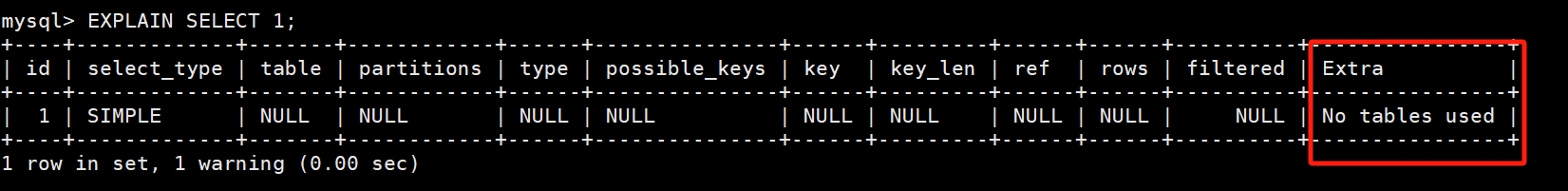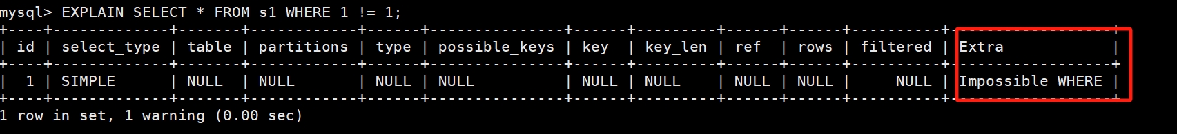 WHERE字节永远为FALSE时EXPLAIN SELECT * FROM s1 WHERE 1 != 1;