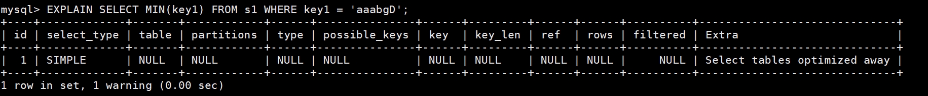 // 有满足WHERE子句记录时, EXPLAIN SELECT MIN(key1) FROM s1 WHERE key1 = 'aaabgD';