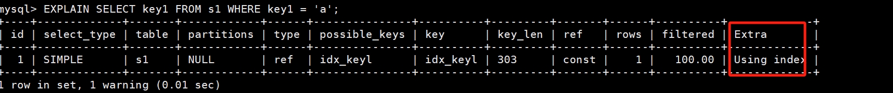 EXPLAIN SELECT key1 FROM s1 WHERE key1 = 'a';