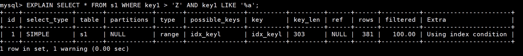 EXPLAIN SELECT * FROM s1 WHERE key1 > 'Z' AND key1 LIKE '%a';