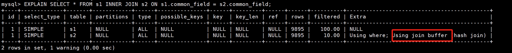 EXPLAIN SELECT * FROM s1 INNER JOIN s1 ON s1.common_field = s1.common_field;