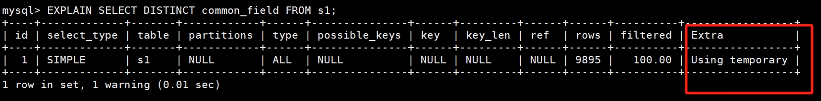 GOUR BY、UNION、DISTINCT操作时,没有使用到有效的索引、此时会建立临时表表来执行查询。执行计划中出现Using temporary不是一个好的征兆、建立和维护临时表会付出很大的成本EXPLAIN SELECT DISTINCT common_field FROM s1;