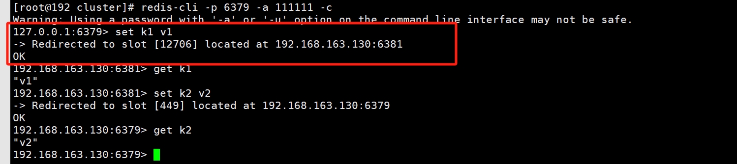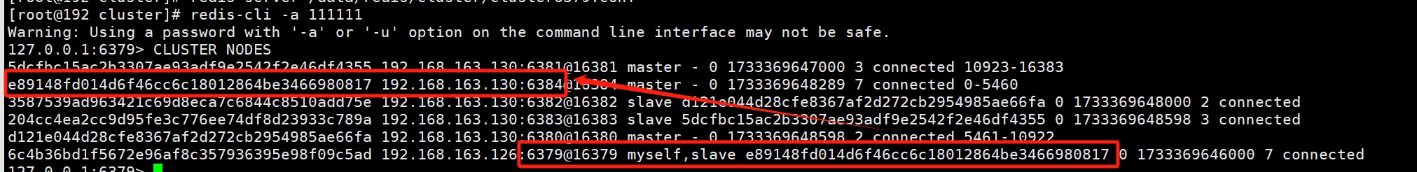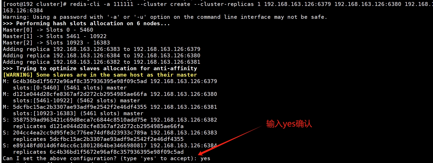 redis-cli -a 111111 --cluster create --cluster-replicas 1 192.168.163.126:6379 192.168.163.126:6380 192.168.163.126:6381 192.168.163.126:6382 192.168.163.126:6383 192.168.163.126:6384