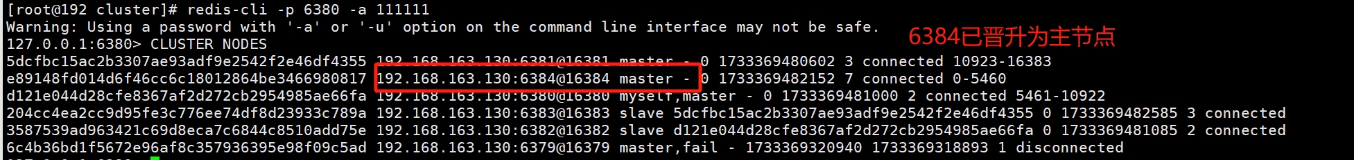 5.2 进入6380,查看集群状态,发现6384已晋升为主节点,6379为下线状态