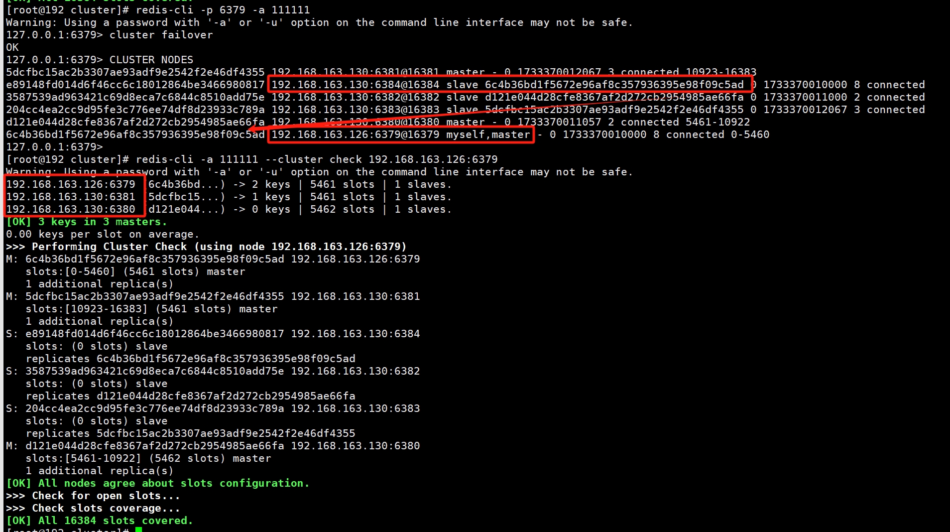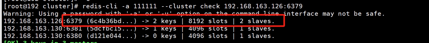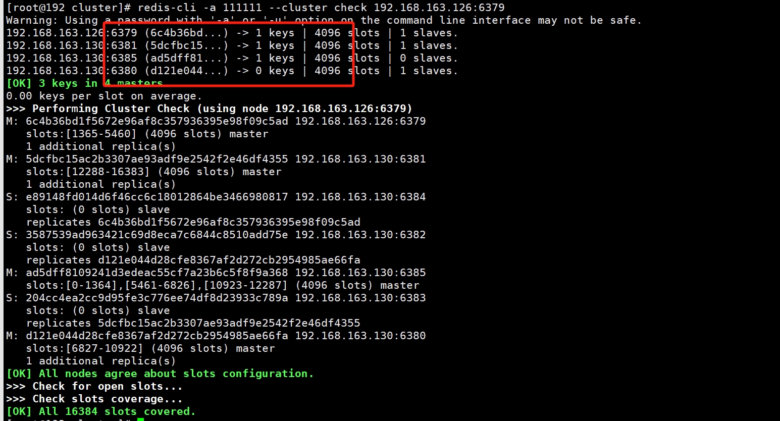 redis-cli -a 111111 --cluster check 192.168.163.126:6379
