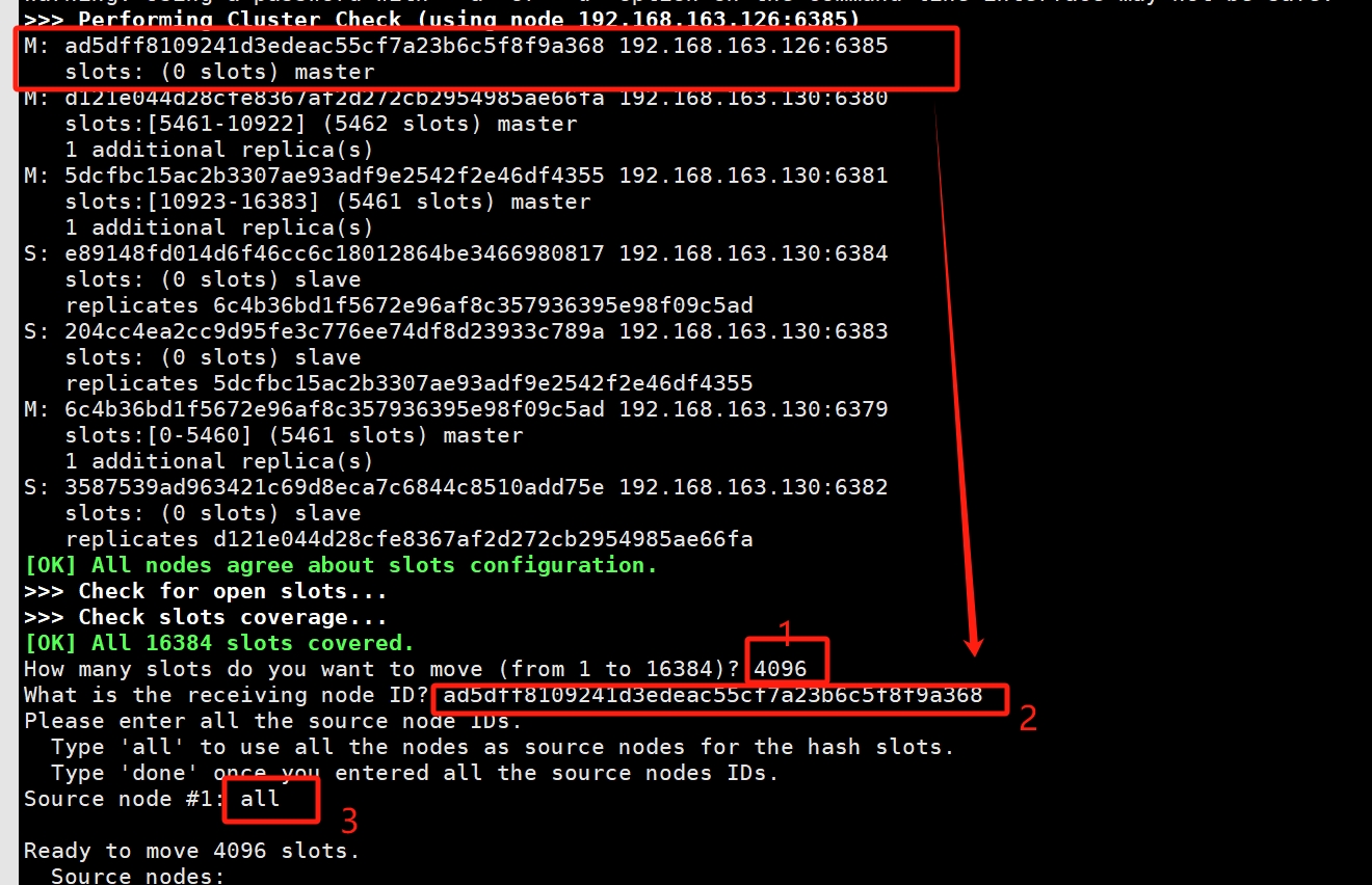 redis-cli -a 111111 --cluster reshard 192.168.163.126:6385- 分配中首先会让你输入分配多少个槽位,输入4096(16384 / 4 = 4096)