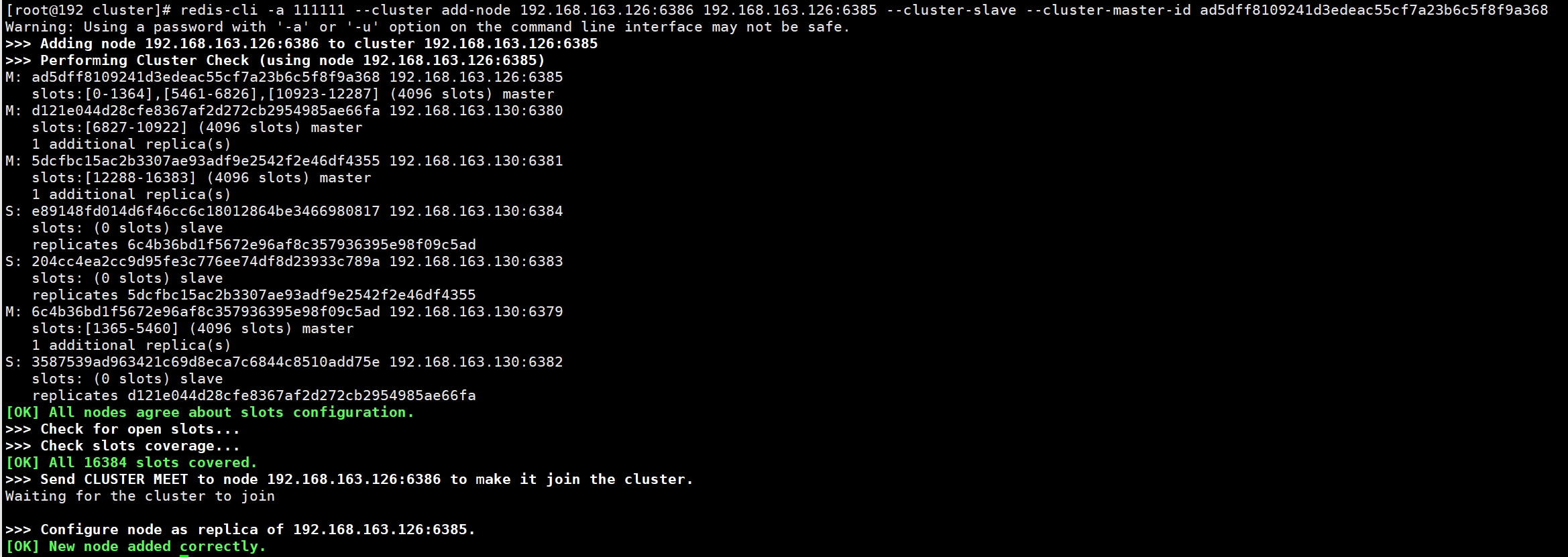 redis-cli -a 111111 --cluster add-node 192.168.163.126:6386 192.168.163.126:6385 --cluster-slave --cluster-master-id ad5dff8109241d3edeac55cf7a23b6c5f8f9a368