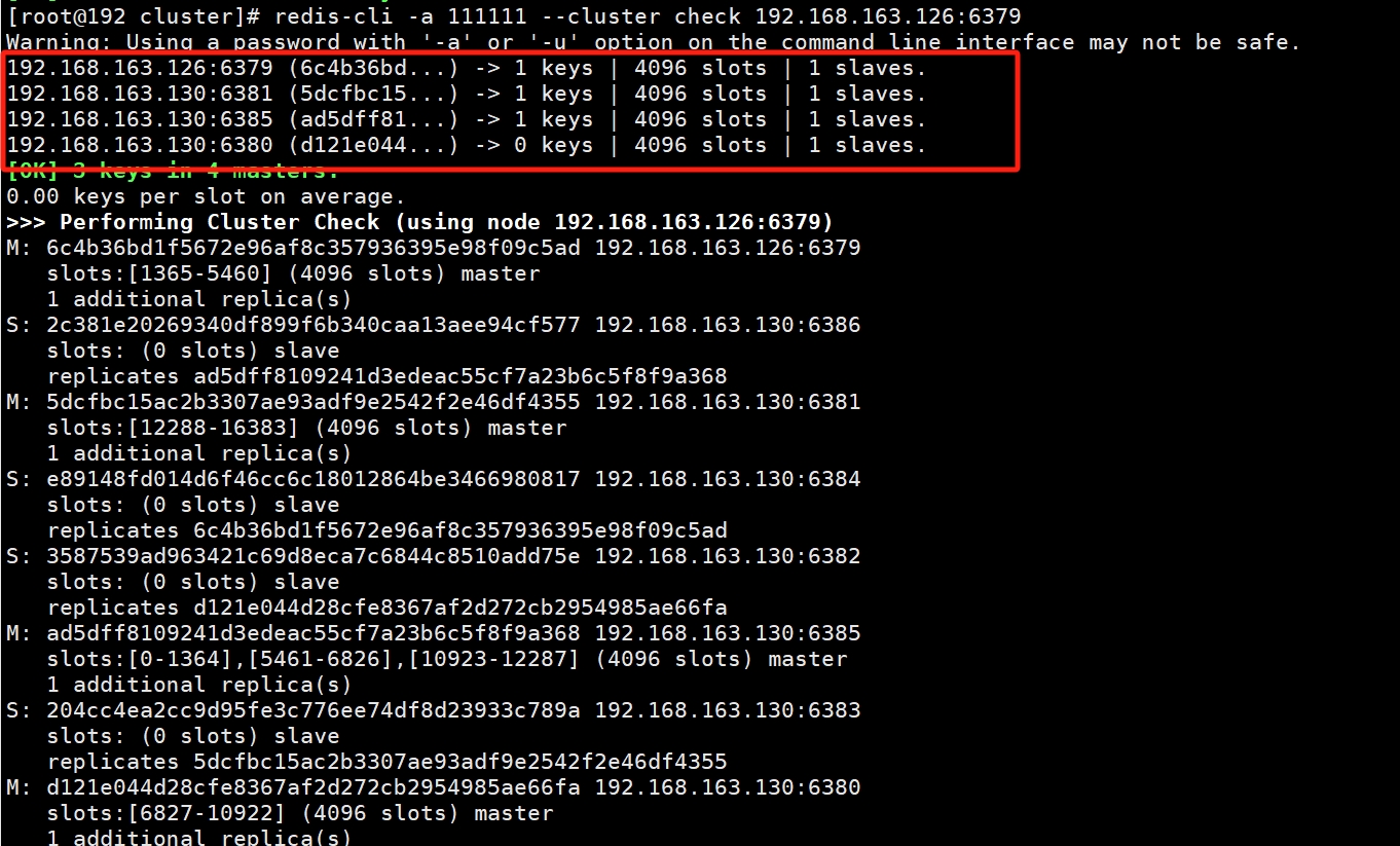 redis-cli -a 111111 --cluster check 192.168.163.126:6379四个主节点、一个节点4096个槽位