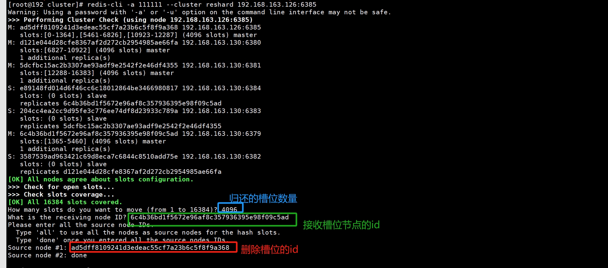 redis-cli -a 111111 --cluster reshard 192.168.163.126:6385依次输入**、、**、done、yes
