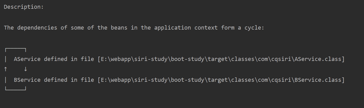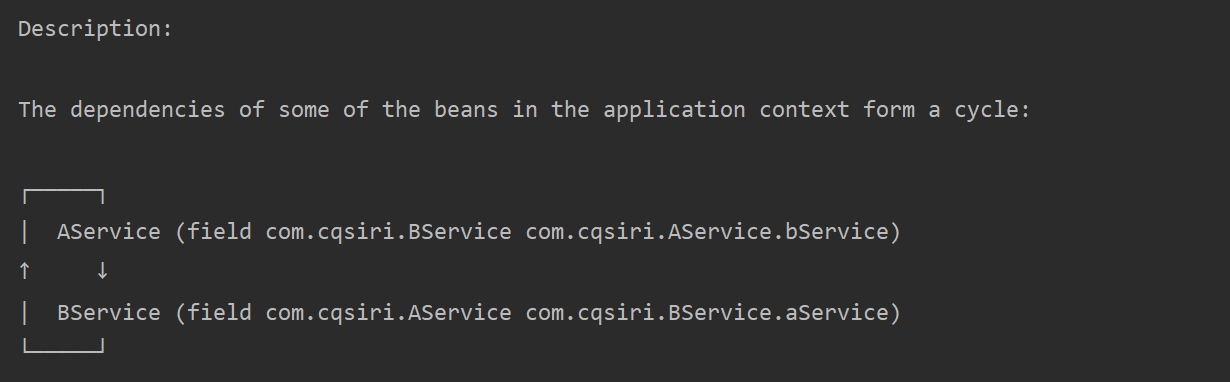 @Service public class AService { BService bService; public AService(BService bService) { this.bService = bService; } } @Service public class BService { AService aService; // 创建Bservice时,去容器拿AService、但发现AService正在创建中、无法提供AService的实例 public BService(AService aService) { this.aService = aService; } }