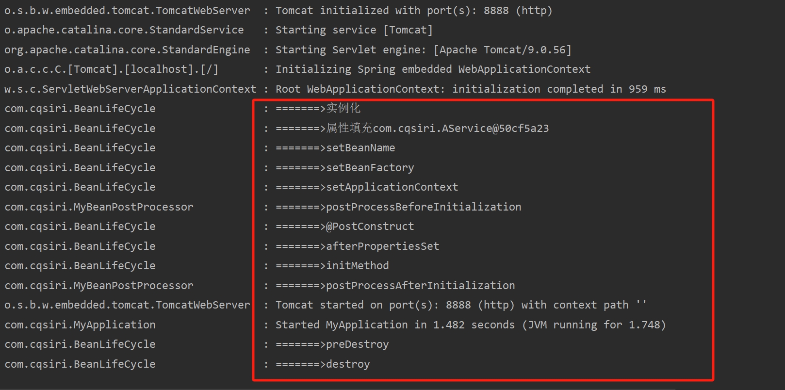 @SpringBootApplication public class MyApplication { public static void main(String[] args) { ConfigurableApplicationContext context = SpringApplication.run(MyApplication.class, args); context.close(); } @Bean(initMethod="initMethod") public BeanLifeCycle beanLifeCycle() { return new BeanLifeCycle(); } }启动后,控制台结果