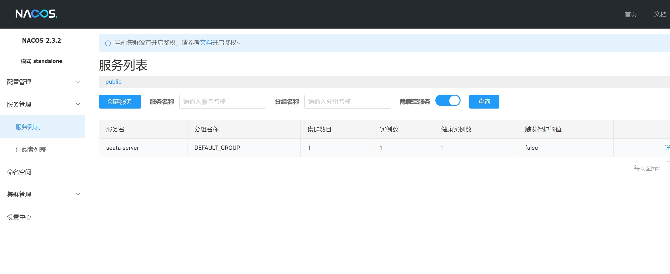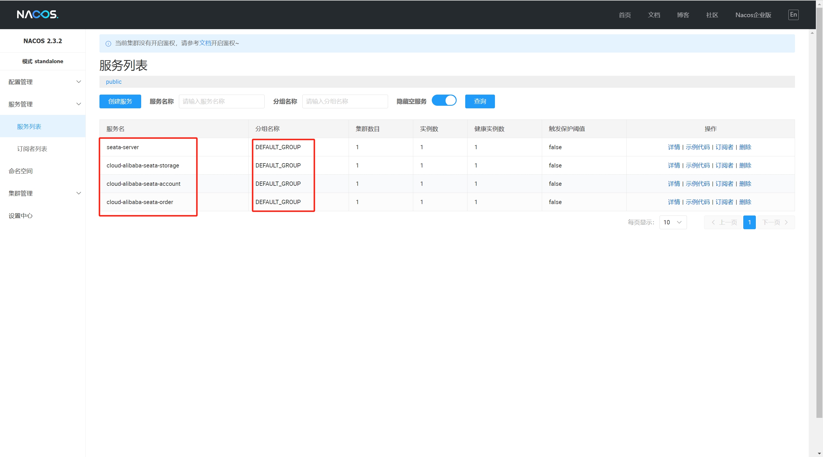 查看nacos控制台,seata、帐户、仓库、订单都注册进nacos,且都在一个GEOUP下