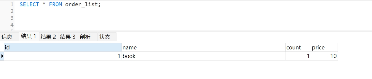 创建一个订单,用户id1,商品为book,数量1,单价10