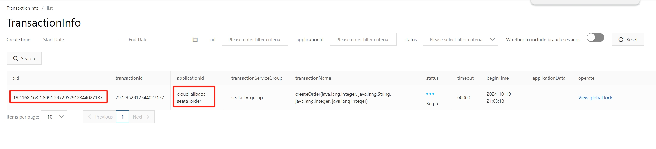 Begin new global transaction applicationId: cloud-alibaba-seata-order, transactionServiceGroup: seata_tx_group, transactionName: createOrder(java.lang.Integer, java.lang.String, java.lang.Integer, java.lang.Integer), timeout:60000, xid:192.168.163.1:8091:2972952912344027137seata控制台