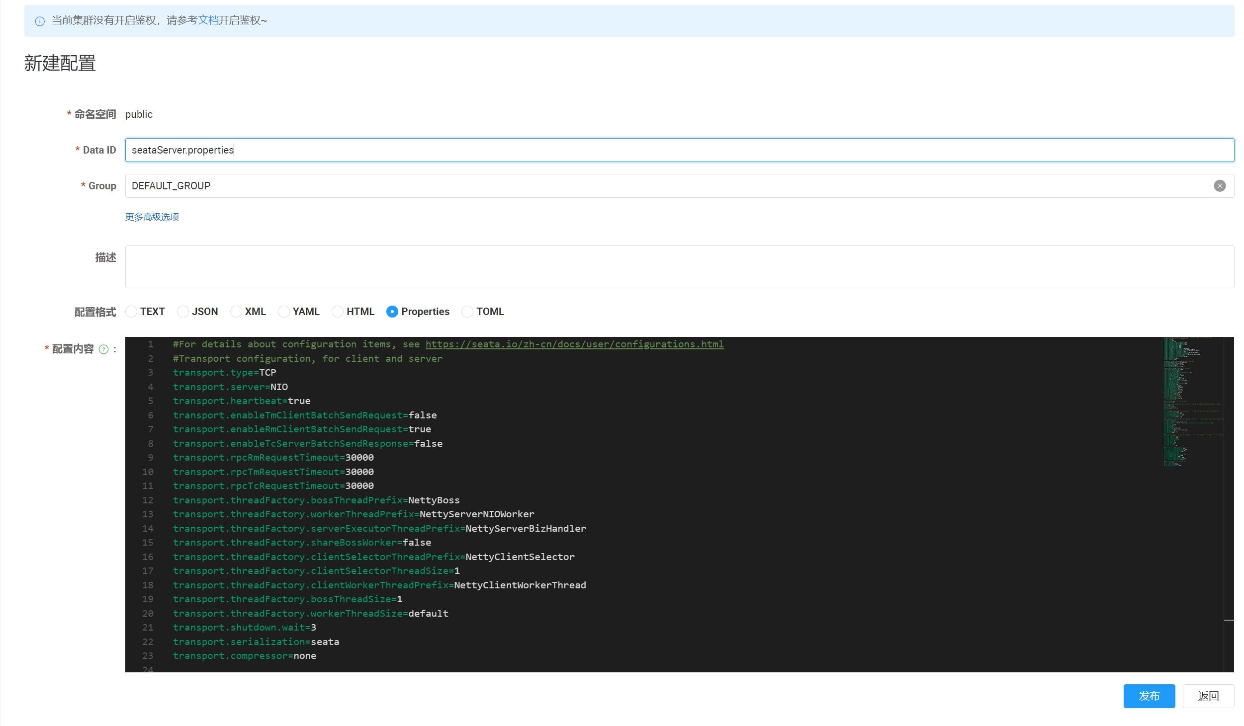 nacos 新建配置,此处 Data ID 为 seataServer.properties,(Data ID可以自己修改,但是必须与第2步配置文件里面的data-id配置保持一致)。配置内容参考https://github.com/apache/incubator-seata/tree/develop/script/config-center 的 config.txt 并按需修改保存。