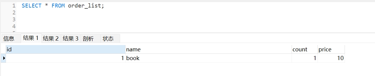 CREATE TABLE `order_list` ( `id` bigint NOT NULL, `name` varchar(255) DEFAULT NULL, `count` int NULL DEFAULT NULL, `price` int NULL DEFAULT NULL, PRIMARY KEY (`id`) ) ; SET FOREIGN_KEY_CHECKS = 1;代码。重点:加上全局事务注解@GlobalTransactional