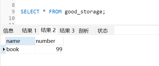 CREATE TABLE `goods_storage` ( `name` varchar(255) NOT NULL, `number` int NULL DEFAULT NULL, PRIMARY KEY (`name`) USING BTREE ); SET FOREIGN_KEY_CHECKS = 1; INSERT INTO `seata-demo`.`goods_storage` (`name`, `number`) VALUES ('book', 100);代码
